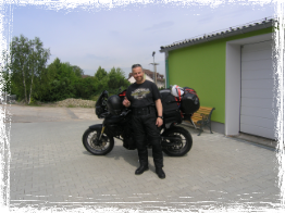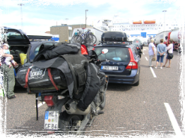 Nachdem alles auf das Motorrad gepackt war und mich 3 meiner Freunde verabschiedet hatten, bin ich gegen 11.00 Uhr in Ullendorf an unserer Garage gestartet. Ich fuhr bis oberhalb von Berlin ausschließlich Landstraße, ging dann aber wegen des Feierabendverkehrs zum Freitag nachmittag auf die Autobahn bis nach Rostock. Kurz nach 18 Uhr kam ich dann am Fährhafen an. 21 Uhr war ich dann samt Bike auf der "Tom Sawyer" der Fährlinie "TT-