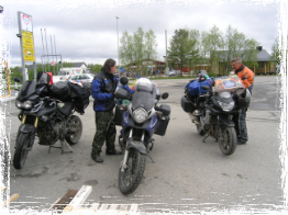 Nachdem dem Frühstück brachen wir gemeinsam Richtung schwedisch/finnische Grenze bei Kaaresuvanto auf. Leichter Nieselregen begleitete uns. Während einer kleinen Erholungspause nach Schotterpisten stieß Bernd aus Göttingen mit seiner 1200er Bandit zu uns. Er fragte, ob er weiter gen Norden mit uns mitfahren können. Wir stimmten dem zu und nun waren wir bereits drei "Alleinreisende". So fuhren wir weiter durch Finnland und schließlich Norwegen bis kutz hinter Alta. Nun waren wir dem Kap bereits sehr nahe gekommen, was an den Temperaturen kurz über dem Gefrierpunkt zu spüren war. Dass wir zu dritt waren, machte die Entscheidung bei einem Preis von 47 € pro Person für ein gemeinsames Zimmer wesentlich leichter. So konnten wir Sachen trocknen, anständig kochen und richtig heiß duschen. Gegen 01.00 Uhr nachts war es dann Zeit zum Schlafen.